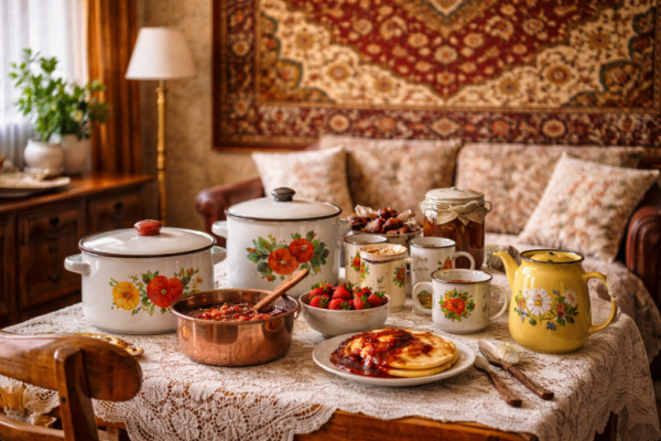 Белые кастрюли с цветочками, кружки с ободком, медные тазы и ковши долго считались «бабушкиным наследством». Их заменяли на современный металл и пластик. Сейчас эмалированную и медную посуду коллекционируют, используют в фуд-съемках и ставят на открытые полки как элемент декора. В кафе в стиле ретро нередко можно увидеть подачу именно в такой утвари. Факт: качественная советская эмаль не впитывает запахи и при бережном использовании служит десятилетиями. А медная посуда ценится за равномерное распределение тепла — именно поэтому её до сих пор используют профессиональные повара.