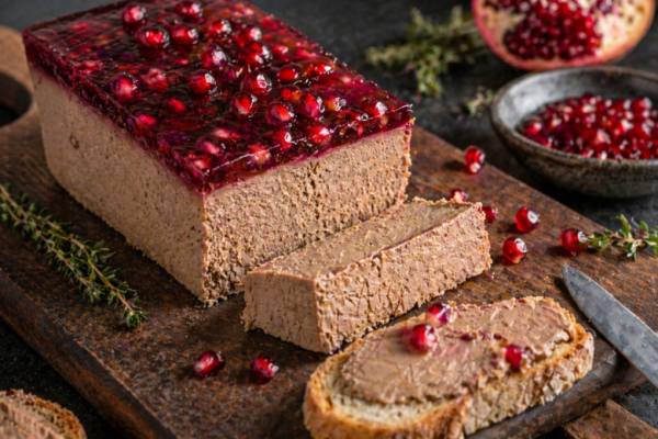 Во Франции без таких закусок не обходится ни один стол, и не зря: вкус получается глубокий, мягкий и насыщенный. Печень даёт нежную текстуру, коньяк — лёгкую ароматную нотку, а сверху можно сделать эффектный слой с гранатом.