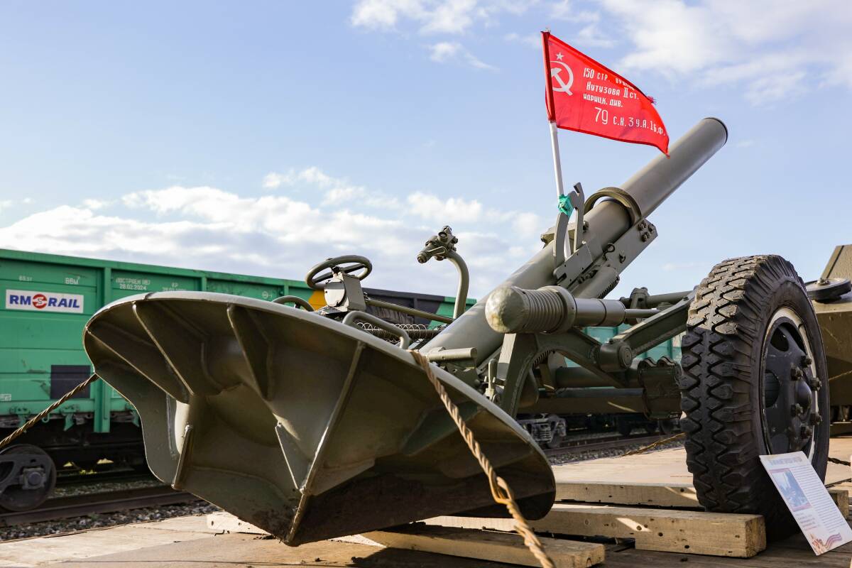 В составе ретро-поезда представлены редкие образцы военной техники, а также тематические вагоны с портретами героев-железнодорожников.