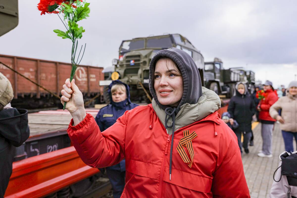 Сам состав оформлен в стилистике военных лет – с еловыми ветвями, звёздами и георгиевскими лентами.