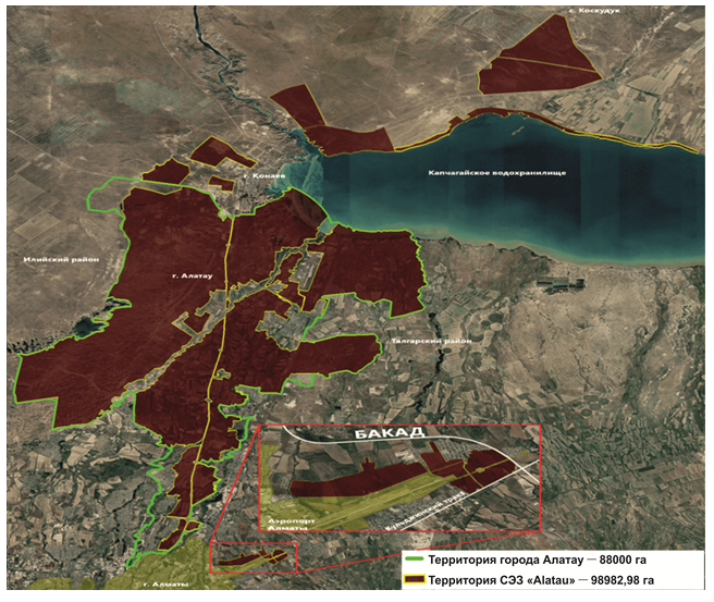 Согласно постановлению правительства, СЭЗ будет расположена на территории городов Қонаев и Алатау, Талгарского и Илийского районов Алматинской области.