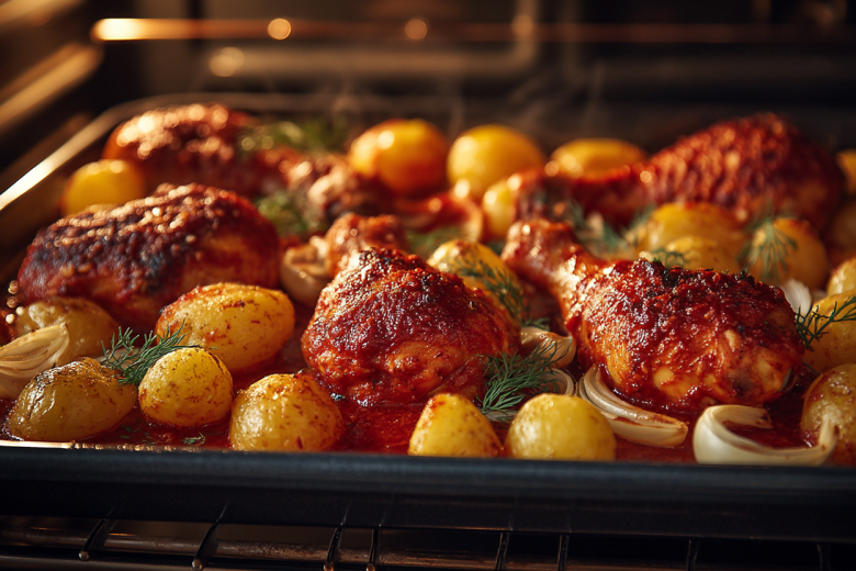 В процессе запекания голени становятся сочными и покрываются аппетитной глянцевой корочкой, а картошка и лук, томясь в ароматном соусе, пропитываются куриным соком и специями.