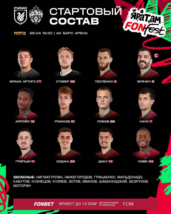 «Рубин» опубликовал состав на матч против московского ЦСКА 2026-04-25 17:33:52