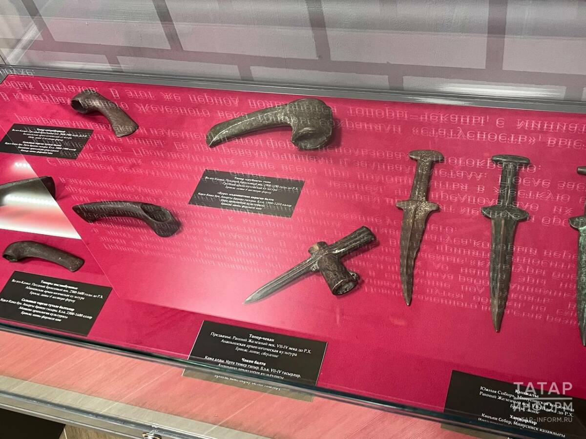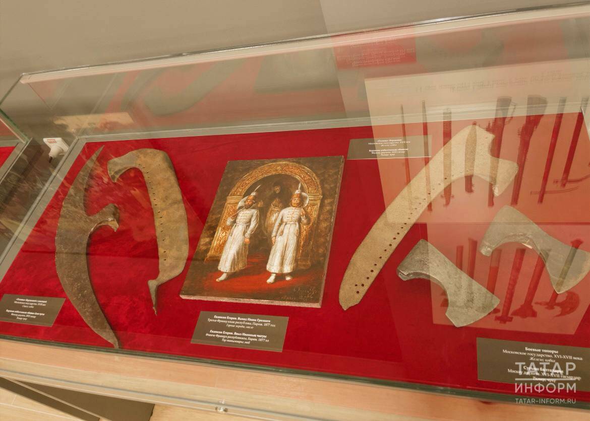 Самое старое орудие на выставке – сверленый топор эпохи неолита, 5-е тысячелетие до нашей эры. Самое новое – клинки японских солдат 2-й половины 20 века, а также парадные шашки германских офицеров 1-й половины 20 столетия, шашка для командующего состава Красной Армии, произведенная фабричным способом на Златоустовской оружейной фабрике в 1932 году, рассказал об экспонатах автор выставки, заведующий отделом специального хранения Нацмузея РТ Владислав Мухин.