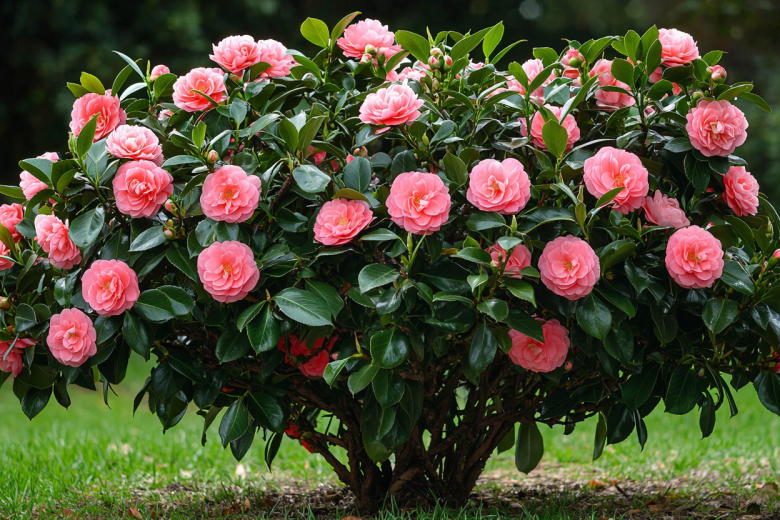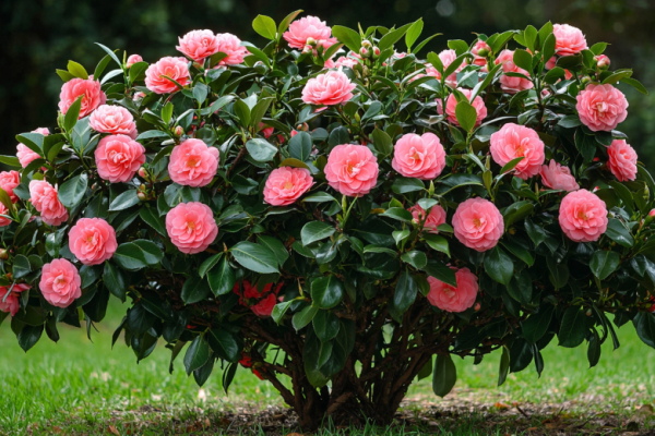 Цветение камелии длится с осени до весны, иногда на протяжении 2–3 месяцев, даря саду яркие краски в пасмурные дни. Её крупные махровые бутоны могут быть белыми, розовыми, красными, пестрыми и даже желтыми, а глянцевые темно-зеленые листья сохраняют декоративность круглый год.