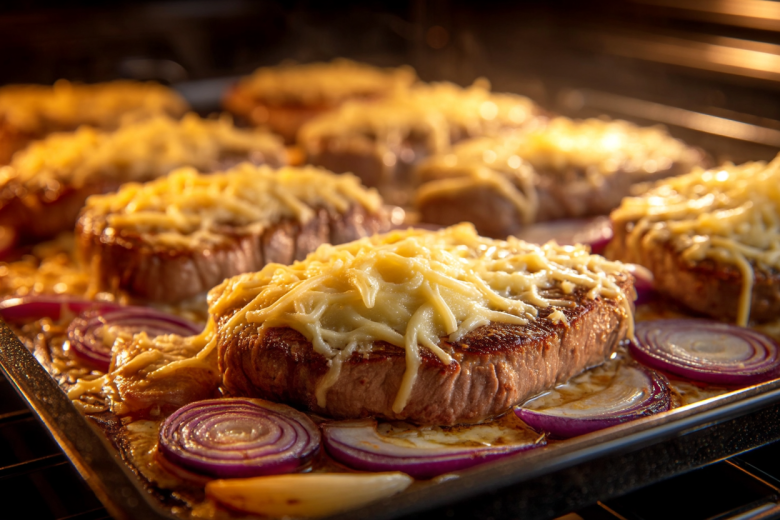Для приготовления понадобится: 500 г свиной вырезки, 2 луковицы, 200 г твердого сыра, майонез, соль, чёрный перец, паприка, сушеный чеснок. Свинину нарежьте поперек волокон на стейки толщиной 2-2,5 см. Слегка отбейте. Посолите и поперчите с двух сторон. Лук нарежьте тонкими полукольцами. Сыр натрите на крупной терке. Разогрейте духовку до 200°C. Противень смажьте маслом. Выложите стейки рядом друг с другом. Сверху разложите лук и густо смажьте майонезом. Затем щедро посыпьте тертым сыром. И завершающим штрихом снова слегка смажьте майонезом поверх сыра — это поможет образовать красивую румяную корочку. Запекайте ровно 25-30 минут. Если сыр сверху начнёт сильно подгорать, можно накрыть фольгой на последние 10 минут.