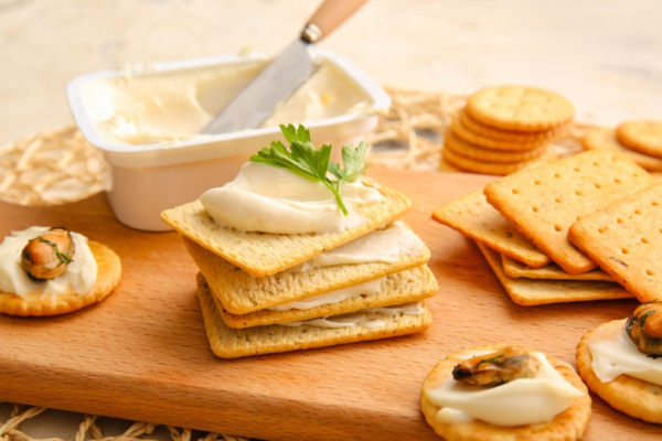 Для приготовления понадобится по 180 г твердого сыра (например, чеддар, пармезан или их смесь), холодного сливочного масла и муки, а также щепотка соли. Сыр натираем на мелкой терке. Холодное масло нарезаем кубиками. В чашу кухонного комбайна выкладываем сыр, масло, муку и соль. Несколько раз короткими импульсами измельчаем смесь, пока она не соберётся в крошку, которая при сжатии в ладони слипается в комок. Не нужно замешивать гладкое тесто! Полученную массу выкладываем на пищевую плёнку, собираем в плотный брикет, заворачиваем и убираем в холодильник минимум на 30 минут (можно на ночь). Охлаждённое тесто делим на 3-4 части для удобства. Каждую часть раскатываем между двумя листами пергаментной бумаги в пласт толщиной 2–3 мм. Снимаем верхний пергамент и нарезаем тесто острым ножом или фигурным колесиком на квадраты, ромбы или прямоугольники. Аккуратно, вместе с нижним пергаментом, перекладываем на противень. Выпекаем в разогретой до 180 °C духовке около 10–12 минут, пока края не подрумянятся. Очень важно: пока крекеры горячие, они мягкие. Аккуратно разделите их по нарезанным линиям и дайте полностью остыть на решетке — только тогда они станут идеально хрустящими.