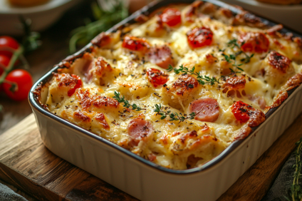 Форму для запекания смазываю маслом. Выкладываю ломтики хлеба в один слой. Если хлеб очень свежий, можно немного подсушить его на сухой сковороде. Ветчину или курицу нарезаю небольшими кубиками, помидоры черри режу половинками, зелень мелко рублю. Равномерно распределяю начинку поверх хлеба. В миске взбиваю яйца с молоком, солью и перцем до однородности. Заливаю этой смесью хлеб с начинкой, слегка прижимаю ложкой, чтобы вся масса пропиталась. Сверху обильно посыпаю тертым сыром. Оставляю на 5-7 минут для пропитки. Выпекаю в разогретой до 180°C духовке 25-30 минут до золотистой сырной корочки. Даю немного остыть в форме, затем нарезаю на порции. Подаю тёплой со сметаной или свежими овощами.