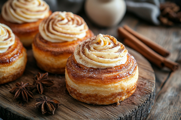 Глазурь здесь — не просто украшение. Это последний, решающий контраст. Тёплая, почти горячая булочка, пропитанная коричным сиропом, встречается с прохладной кисловато-сливочной массой из взбитого крем-сыра.